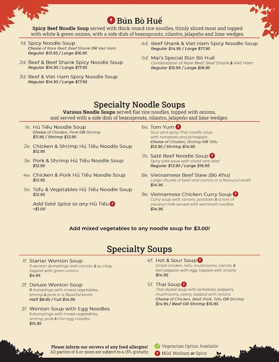 Mai's Kitchen specializes in a tantalizing array of dishes that are sure to satiate any palate. As you peruse the menu, you’ll find standout options like the Hủ Tiếu Noodle Soup available in delightful variations such as Chicken & Shrimp, Pork & Shrimp, and even a vegan-friendly Tofu & Vegetables option. Each bowl is meticulously crafted to deliver a rich, savory experience that speaks to both tradition and vibrant taste.